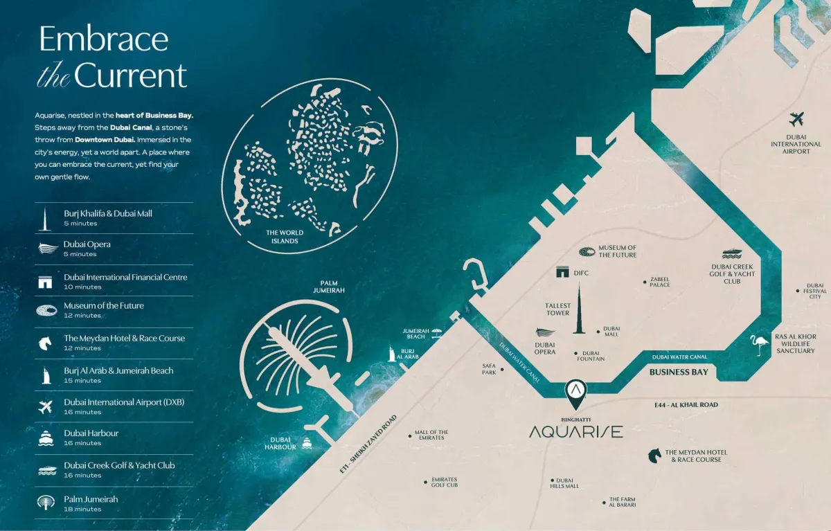 Aquarise is situated at Business Bay, one of the active and central zones in Dubai. It is close to it is the Dubai Canal and just a only a short distance from Downtown Dubai, providing quick access to the areas that are most well-known in the city. From luxurious shopping and five-star Hotels to corporate towers, as well as fine dining, everything is close by.